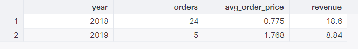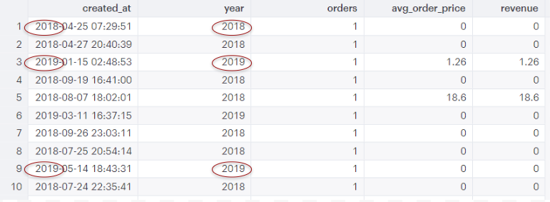 This query shows values for ALL of 2018 and only values to date in 2019 (currently 11/6/2019). Row 2 is an aggregation of all values where “2019” is the “year” in the “created_at” column, but it obviously can’t include orders that haven’t happened yet.