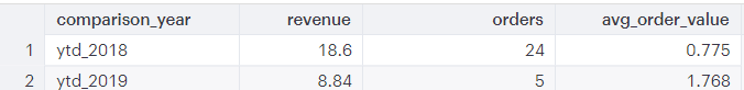 SELECT CASE WHEN created_at BETWEEN date_trunc('year', current_date) - INTERVAL '1 year' AND current_date - INTERVAL '1 year' THEN 'ytd_2018' WHEN created_at BETWEEN date_trunc('year', current_date) AND current_date THEN 'ytd_2019' END AS comparison_year, SUM(total_price) AS revenue, COUNT(id) AS orders, AVG(total_price) AS avg_order_value FROM public.shopify_orders WHERE date_part('year', created_at) >= date_part('year', current_date) -1 GROUP BY comparison_year