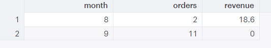 SELECT date_part('month', created_at) AS month, COUNT(id) AS orders, SUM(total_price) AS revenue FROM public.shopify_orders WHERE month IN (8, 9) AND date_part('year', created_at) = 2018 GROUP BY month ORDER BY month ASC