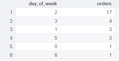 This query selects the day of the week (‘dow’) from the “created_at” column and inserts the value into a column called “day_of_week”. It counts the number of unique order “ids” and puts this value in a column called “orders”. The data is from a table called “shopify_orders” and the rows are aggregated (grouped) by “day_of_week” (Sunday = 0). The results are ordered by the “orders” column values in descending order.