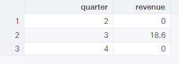 The output shows revenue by quarter in 2018 (there were no values for quarter 1). You can see that quarter 3 was the most prosperous quarter!