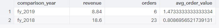 This query has a similar structure to the previous one. We’re selecting all rows where the “created_at” column has a date between Oct 1, 2017 and Sept 30, 2018 and labeling these rows “fy_2018” in the “comparison_year” column. We’re doing the same thing with dates that fall in FY 2019 (labeling them “fy_2019”). We’re grouping rows with matching values in the “comparison_year” column. This query calculates revenue, orders and average order value for each fiscal year. Finally, we’re only including dates from 2017-2019 in our results (‘year’ must be greater than or equal to the current year - 2).