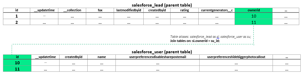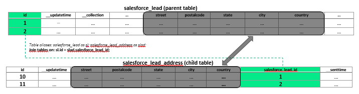 Looking at the above example, salesforce_lead table is the parent table. The other two tables are child tables: salesforce_lead_address and salesforce_lead_attributes.