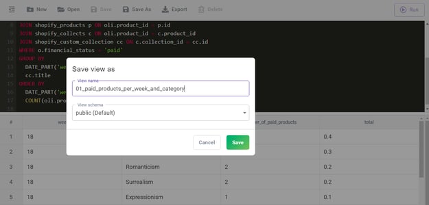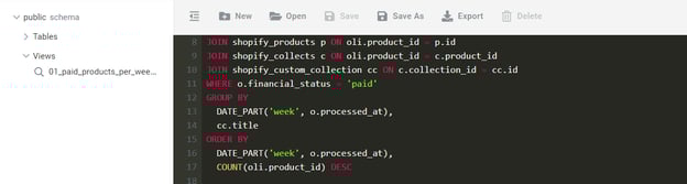 The scenario is the following: You want to create a report that you don’t have by default in Shopify Analytics. The report should display the number of paid products arranged by product collection category and the number of the week in which the order was processed.