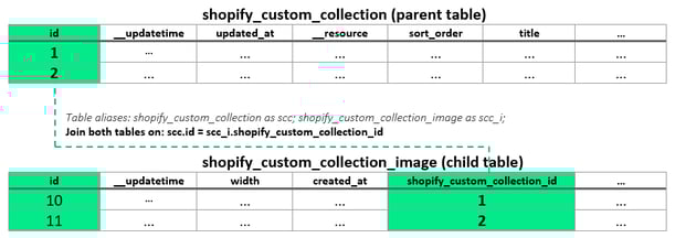 If you take a look at the child table, you’ll notice there is a column named shopify_custom_collection_id. That is exactly what we need to implement table joins. Accordingly, the tables will be joined as follows: