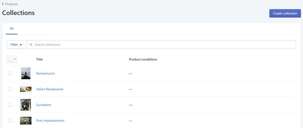 For a quick check of the Shopify data structure, let’s explore a Shopify store that sells artistic paintings and how collections of products are organized within the Collections API.
