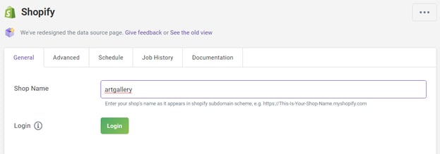 Step 4. Enter your shop name and click on Login. In the example below, the URL of the store is https://artgallery.myshopify.com, so the shop name in this case would be artgallery.