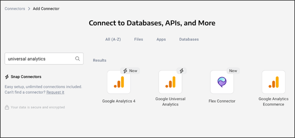 2. Search for Universal Analytics in the Connectors menu, then select your preferred connector settings (make sure to include properties, metrics, and dimensions).